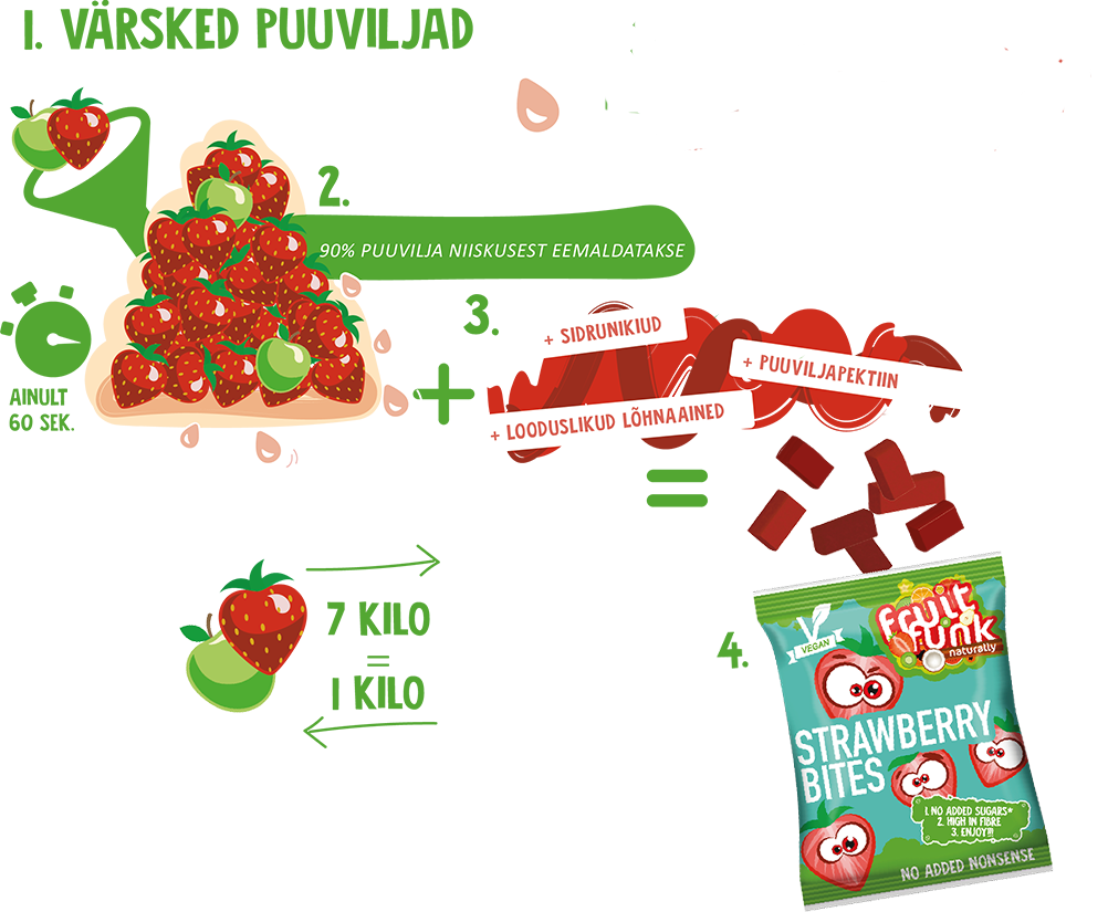 Märkasime, et nõudlus lastele mõeldud maiustuste ja suupistete tervislike alternatiivide järele kasvas. Paljud suured ja tuntud kommitööstusettevõtted ei julgenud täielikult tervislikule sortimendile üle minna kuid meie tegime seda! Aastal 2014 asutasime Fruitfunk’i ja hakkasime lastele valmistama kõige lõbusamaid ja tervislikumaid snäkke.